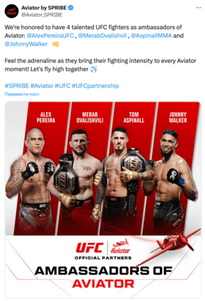 On October 20, 2023, UFC, the leading mixed martial arts organization worldwide, embraced a multi-year sponsorship agreement with Spribe. This partnership ensures that the Aviator logo is a staple on the Octagon canvas at major events, including Pay-Per-View bouts and Fight Nights.